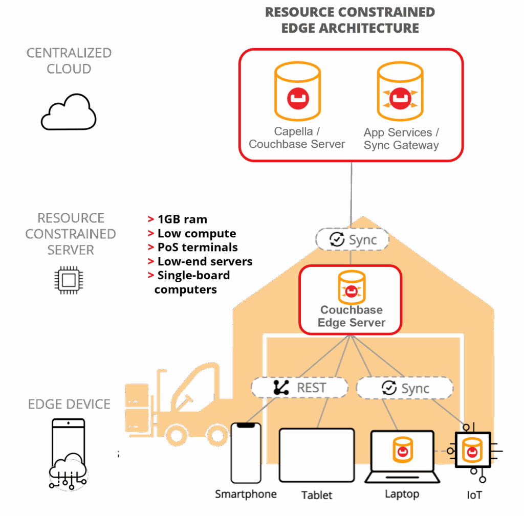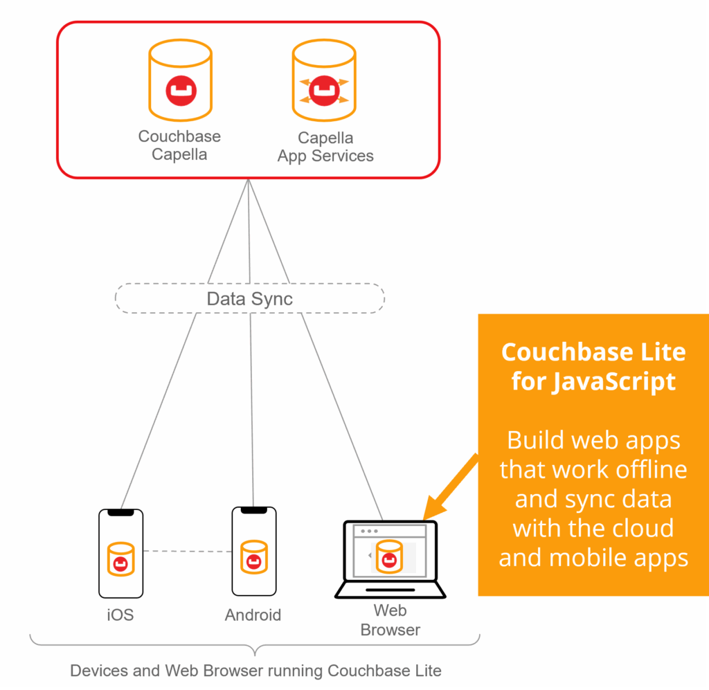 Data sync from cloud to edge: A secure data sync gateway that synchronizes between client and server tiers. Choose hosted data sync with Capella App Services, or install and manage Couchbase Sync Gateway yourself.