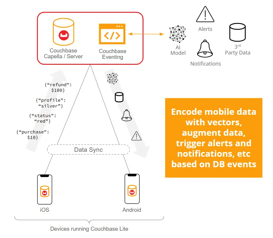 Eventing support in Couchbase Mobile can be used to do things like redact private data or trigger notifications, and it can also be used to manipulate data for AI. For example, if a developer wanted to encode data with vectors from a specific model for semantic search on a mobile device – which may not have access to the model – Eventing functions can call the model in the server tier to vector encode the data when it arrives and then sync it to the mobile device where the vectors are indexed for on device semantic search.